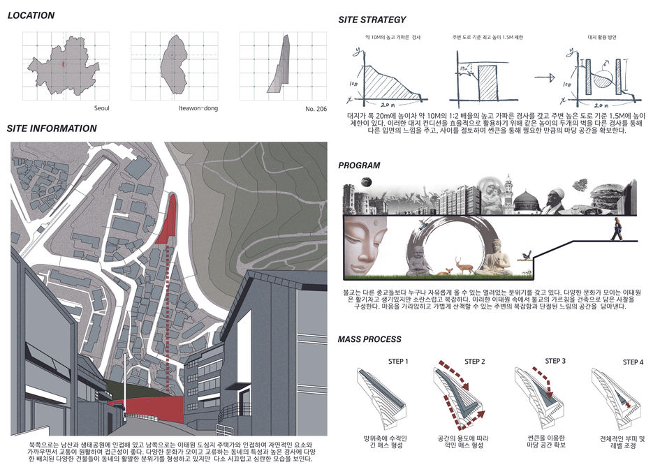 불교의 사찰 건축을 떠올려 보았을 때 우리는 한옥으로 지어진 건물이 산 위의 커다란 부지에 있는 모습을 흔히 생각한다. 이러한 고정관념에서 벗어나 도심지 속 한정된 땅에서도 제대로 표현된 불교 건축물을 구성하였다. 이태원이라는 다양한 문화가 교류하는 활발한 도심지에 위치한, 가볍게 산책하며 쉴 수 있는 낮은 템포의 도심 속 작은 불교 사찰.